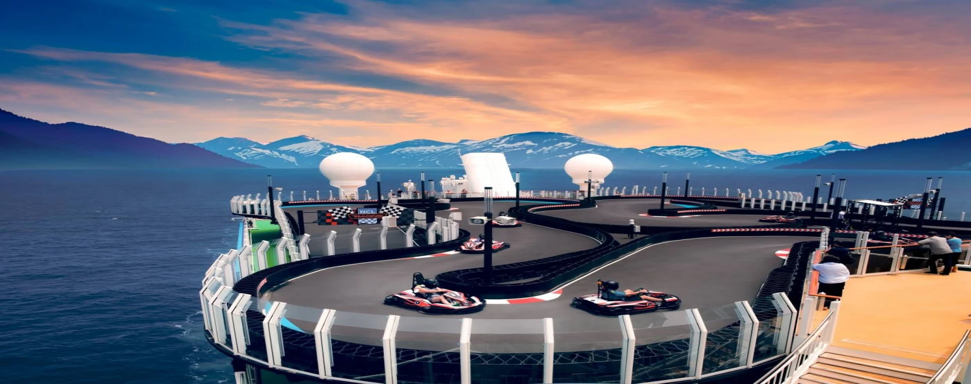 The Norwegian Bliss is a large, luxury cruise ship built by Meyer Werft for Norwegian Cruise Line (NCL) and launched in 2018. It is known for its various entertainment options, including the Bliss Speedway (a go-kart track), water slides like the Ocean Loops, a miniature golf course, and Broadway-style musicals like "Jersey Boys". The ship also features a variety of dining options, a spa, and the 180-degree Observation Lounge, with a capacity for over 4,000 passengers.
